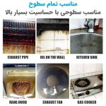 از چدن اجاق، شیشه هود و گاز، کابینت MDF و فلزی گرفته تا سنگ، چوب و کاشی، همه رو بهراحتی تمیز میکنه و برق میندازه.